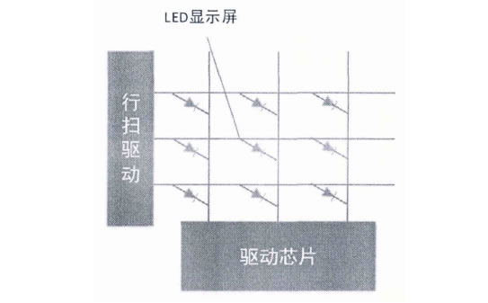 具體而言,主控制器從PC顯示卡處獲取屏幕中各像素的灰度數據,然后分配給若干塊掃描板,掃描板則控制液晶拼接屏上的若干行,而每一行上的顯示信號則通過本行的各個顯示控制單元用串行方法級聯傳輸,每個顯示控制單元都直接面向液晶拼接屏。液晶拼接屏的顯示信息由行驅動和列驅動共同控制,其中驅動芯片的作用就是控制列信號電流的通斷,當驅動芯片控制列信號通斷時,行掃芯片也控制著行信號的通斷,從而顯示出每個像素所需的灰度數據。如下圖所示,為液晶拼接屏驅動示意圖。