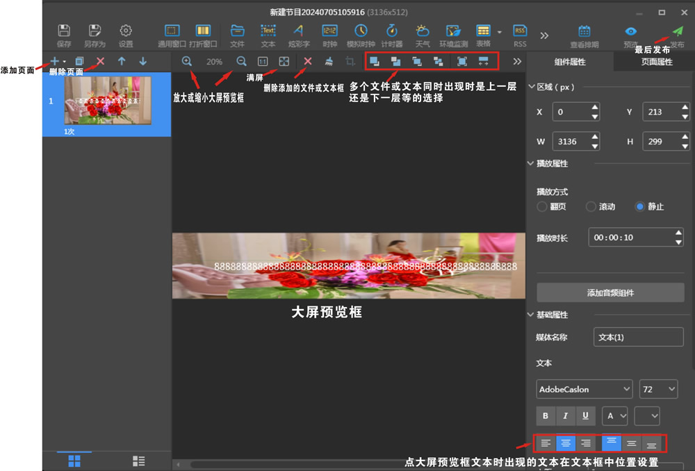 四、編輯節目:首先在終端管理界面,用鼠標點擊終端名稱,再在節目管理界面,點新建,設置大屏寬高點數(不是尺寸),如果先前有節目,只需勾選后點上面編輯就行。圖片和視頻點擊上面文件,點擊后直接從電腦里選擇文件,文字選擇文本。每一次選擇下面大屏預覽框上較左上角就有個顯示框,這個顯示框比較小,可以在右上角設置大小或者用鼠標拉大,也可以用鼠標拖著擺放在屏的任意位置。文本需要雙擊大屏預覽左上角文本框后進行編輯。不然找不到編輯文字的地方。大屏預覽框上面有很多設置功能可以選擇。
